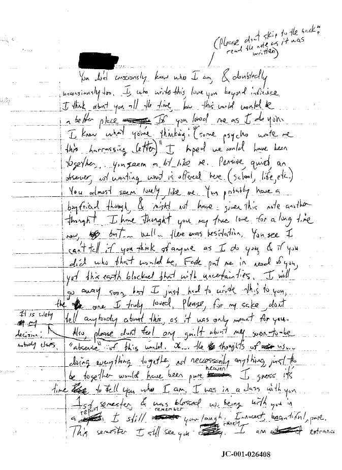 You don't consciously know who I am, & doubtedly unconsciously too. I, who write this, love you beyond infinice. I think about you all the time, how this world would be a better place If you loved me as I do you. I know what you're thinking: "(some psycho wrote me this harassing letter)" I hoped we could have been together... you seem a lot like me. Pensive, quiet, an observer, not wanting what is offered here (school, life, etc.) You almost seem lonely, like me. You probably have a boyfriend, though, & might have not given this note another thought. I have thought you my true love for a long time now, but... well... there was hesitation. You see I can't tell if you think of anyone as I do you, & if you did who that would be. Fate put me in need of you, yet this Earth blocked that with uncertainties. I will go away soon, but I just had to write this to you,
