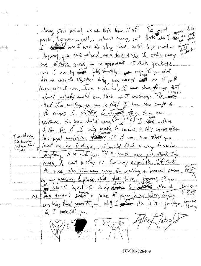 Dylan's handwriting in the letter below is much neater and more legible than his regular entries, a love letter written to a girl who never received it as it was still part of this journal when police took it from his home.]