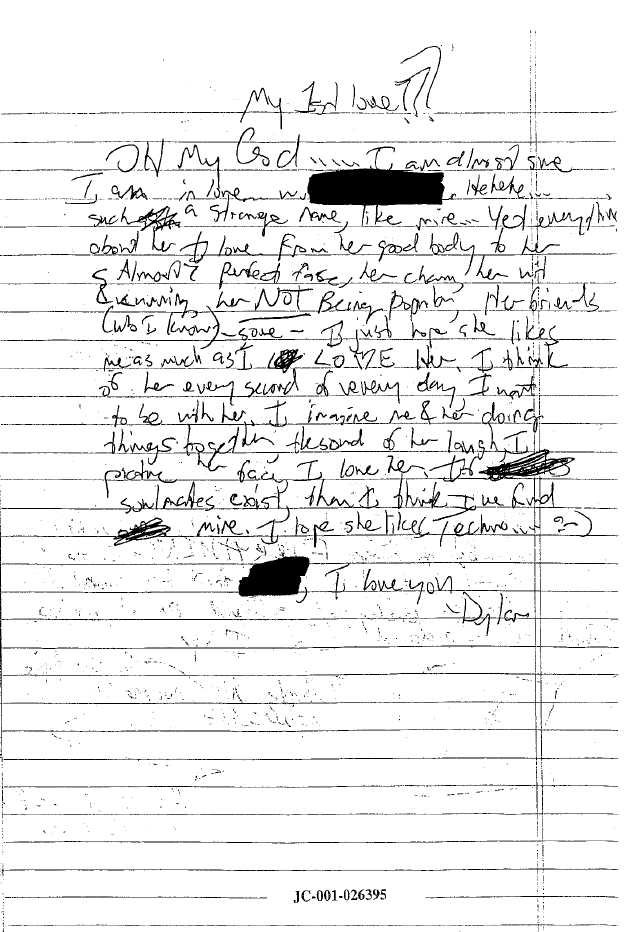 Sometime between 7-23-97 and 9-5-97 Dylan suddenly found "true love". I can't help wondering if this sudden surge of passion was spawned from the fact that his last journal was all about how his friend had abandoned him in favor of spending time with a girl... and how much the last entry had to do with envying his friend as well as missing him. The emotion in the following and subsequent entries seems theatric, giddy, and ultimately unfulfilled as he never actually professes this deep and sudden love to the girl he claims to want so much. It's almost like he picked someone at random to act out a crush on, to compensate for the fact that his friend has a girlfriend and he doesn't.]